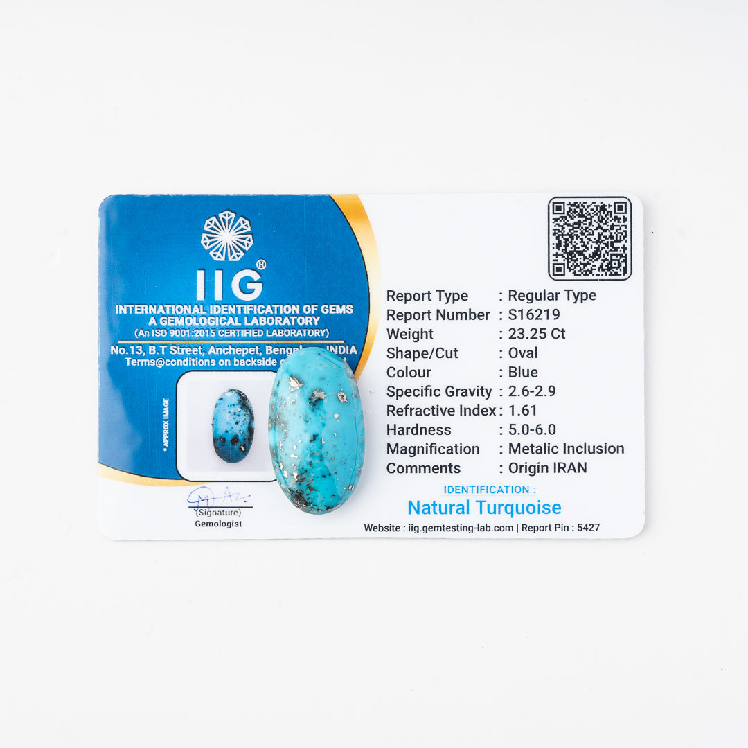 Transform your energy, attract abundance, and safeguard your well-being with the timeless beauty of Irani Firoza. Order your 23.25 Ct gemstone today!