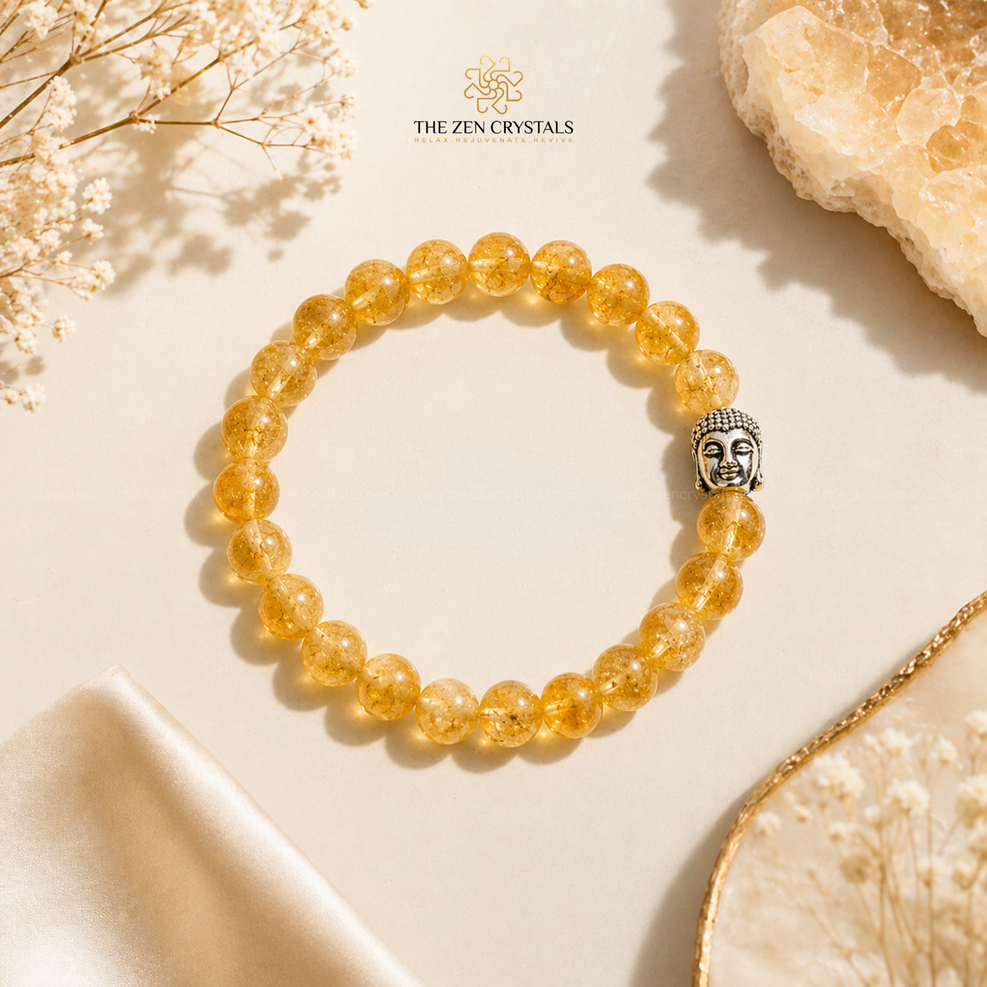 citrine bracelet with Buddha charm on a beige fabric background, featuring 'The Zen Crystals' brand.