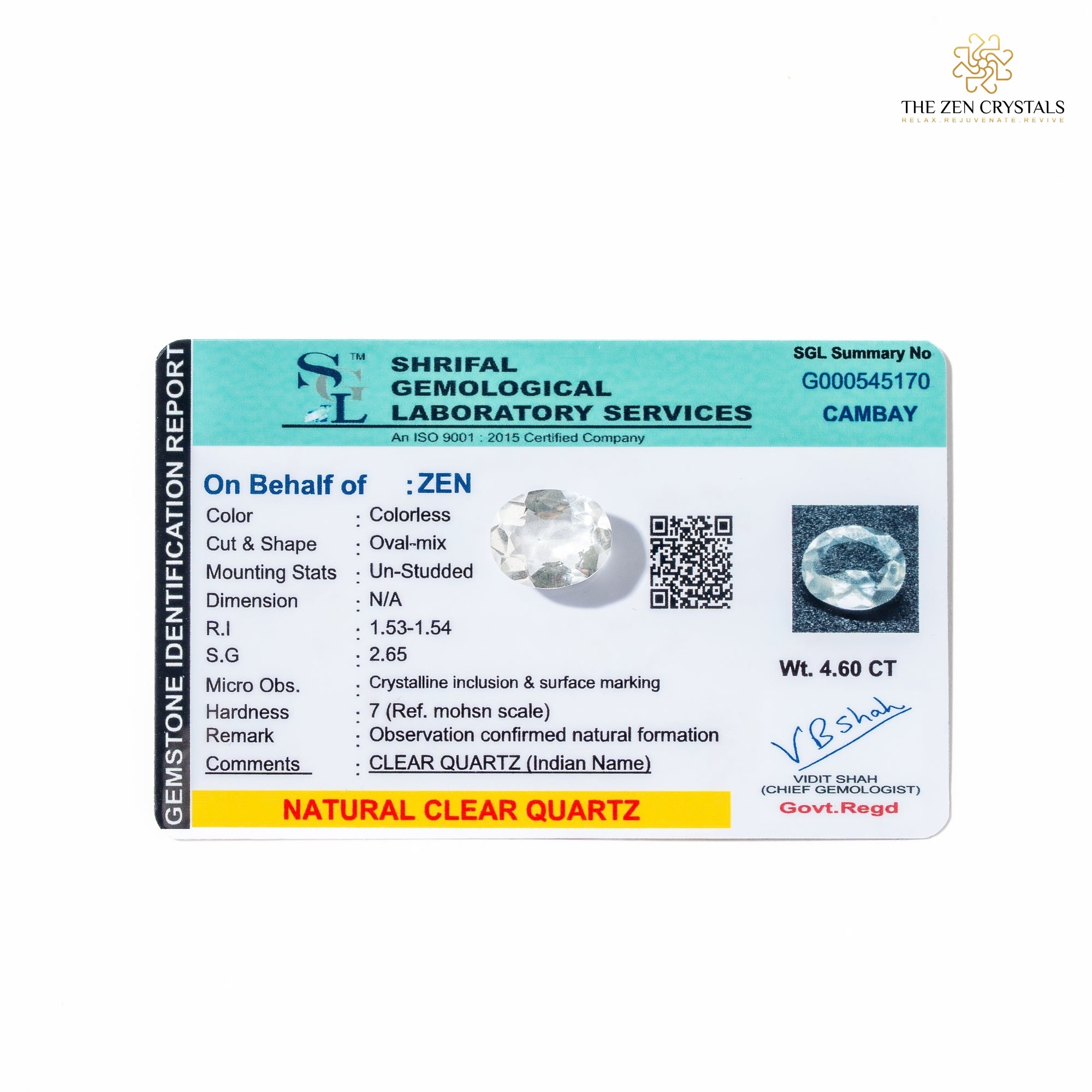Clear quartz crystal on red fabric with promotional text for The Zen Crystals brand.